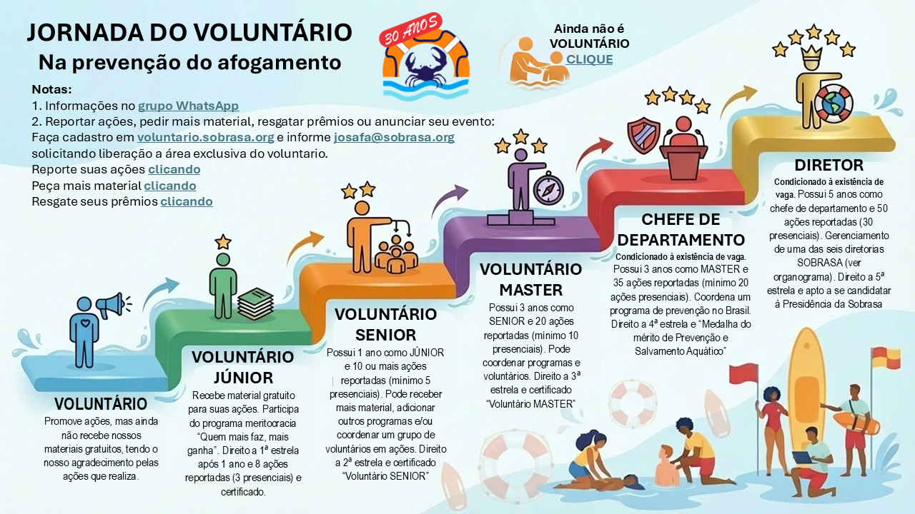 É fundamental ao VOLUNTÁRIO possuir seguro pessoal contra acidentes, e a SOBRASA proporciona com exclusividade além das garantias de cobertura de vida, que você e mais 3 dependentes diretos possam ter consultas on-line de emergência 24h, descontos em farmácias e outros benefícios (a SOBRASA abriu mão de sua comissão em prol da redução do custo ao voluntário). Clique na figura.